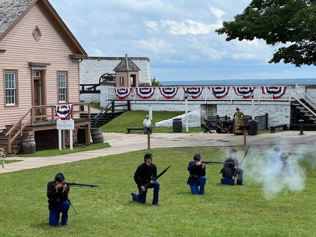 Fort Mackinac. The buildings are original and the signs were very informative. Some of the buildings are the oldest in Michigan. Throughout the day they would have different demonstrations of guns, uniforms, etc. The fort was built in 1780 during the American Revolution. It was a British fort. The commander said this high limestone bluff would protect them from an attack by the Americans. The British had the fort during the War of 1812. After the war the British gave the fort to the U.S. It was an active fort until 1895.