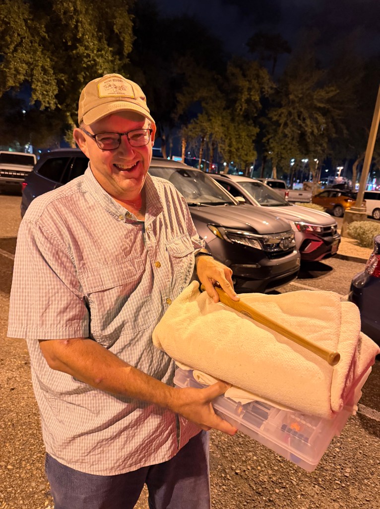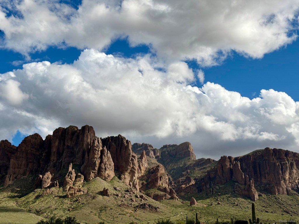 Extra friendly at check in and then we saw our site. It is a curved pull through but we are facing the wrong way. No worries, we pulled on and will just turn around. Well, following the map, we should be able to go this way but wait, that sign says one way only. HAHA We stopped and were looking at the map when a lady volunteer on a golf cart came our way. She stopped and Kevin asked her. She said we should always ask if we have questions because they are always happy to answer and help. Sweet. Then follow her and yes, she got us to our site and the right way. We are at the base of Superstition Mountains. This campground has all paved roads and sites, all deep enough and more for any size, saguaro cactus, sage, and green bushes.