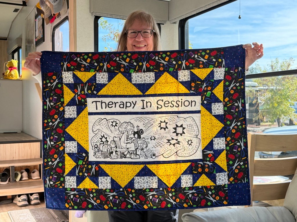 Your campsite looks awesome! And I love that smile on Kevin’s face. He was quite proud of his joke! Now, regarding your speech to text display – I have no idea! But your quilt is lovely!