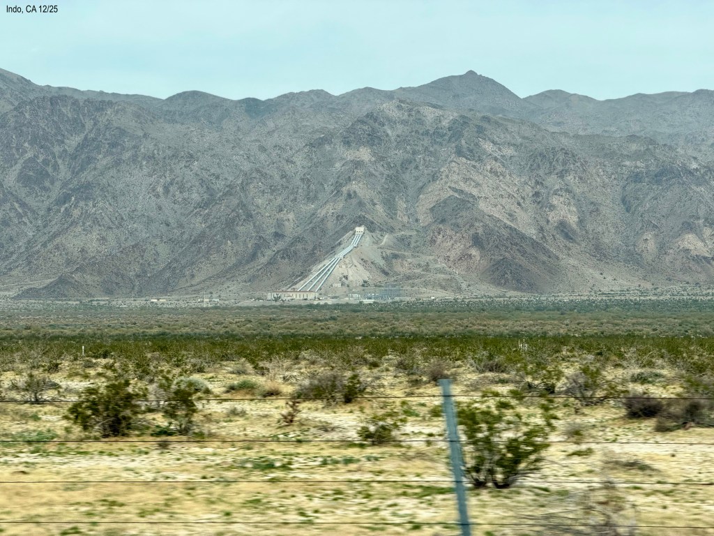With HOWE (footnote 1) parked in the garage at Fancy Storage Unit aka homebase aka new house, we headed west taking I-10. The day was high clouds and very nice to travel. Along the way we saw what looked like a very steep road up the side of a mountain. Then saw a small building. Oh, I remembered learning about this – it is where the Colorado River comes out of the pipes through the mountains from Parker, AZ. Sure enough, long tubes coming out of the mountain and down to a river near town of Essex, California. Traffic wasn’t bad going into the Los Angeles area. We thought holiday traffic would be worse since this is Saturday before Christmas.