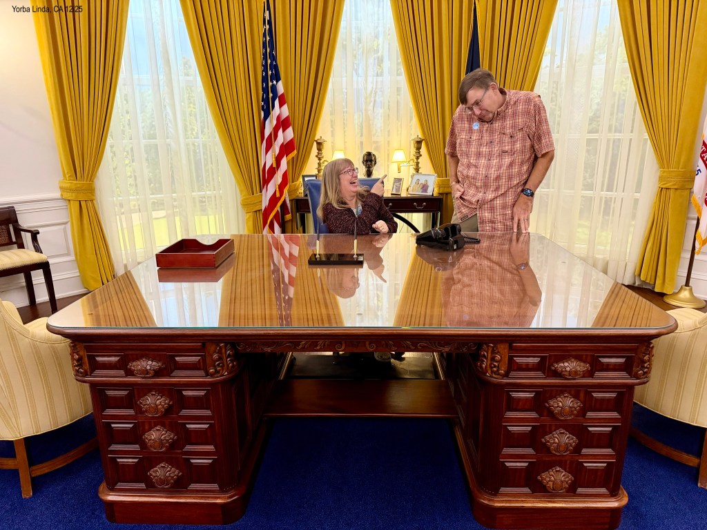 The replica Oval Office was a place you can sit in the replica chair behind the desk. Got some fun pictures there. Outside we saw where President Nixon and Patricia are buried. Her headstone has these words: “Even when people can’t speak your language, they can tell if you have love in your heart.” True! He died 10 months after Patricia. People who knew him said he wouldn’t last long without her.
