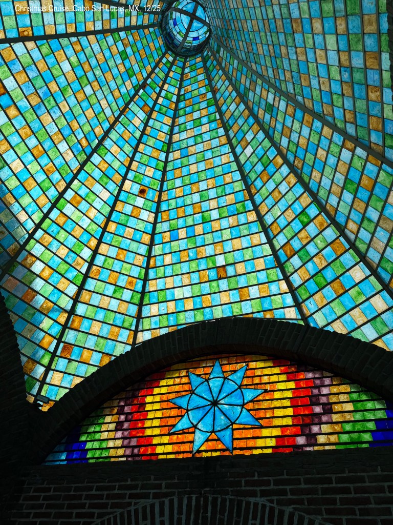 The last stop was at Plaza Mijares. This is a large shopping area decorated fun for Christmas. Mission San Jose del Cabo church. The first one was destroyed by a hurricane and was rebuilt in the 1940s. I thought the windows were so unique in the way they turned. We looked through shops.